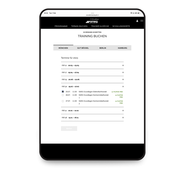 The website presents the training concept and introduces the program and staff. Central element for all visitors is the booking tool, which guides the visitor through the booking process in simple steps: Selection of training location and date, registration of participants to be registered, booking confirmation.